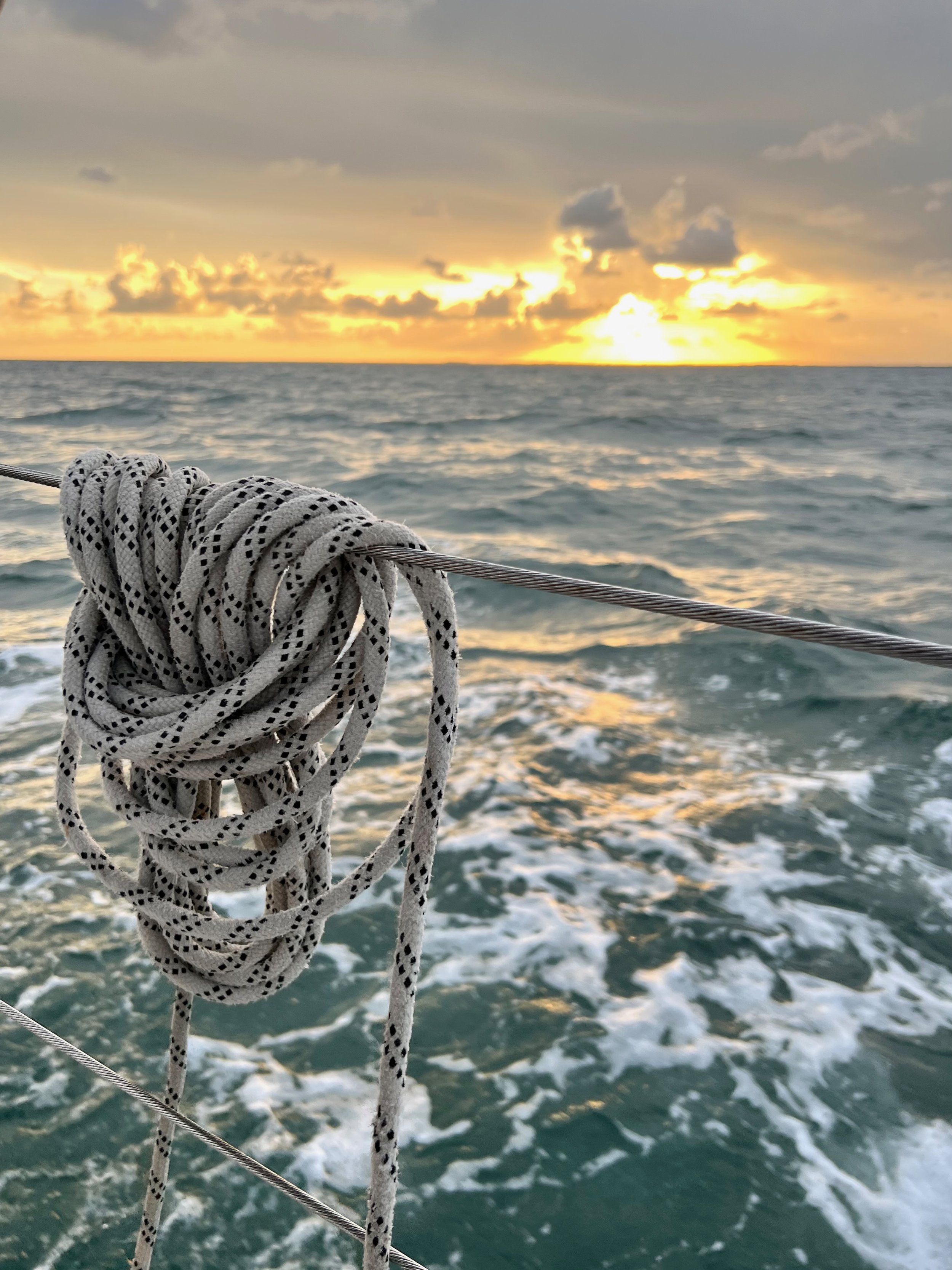 This refers to the shape of Wonder's main sail, which is not a triangle. Instead, it is a trapezoid with its upper edge held aloft by a rod (spar) called a gaff. In total, Wonder can fly 10 sails when under full canvas, though wind conditions rarely make this an ideal sail plan.